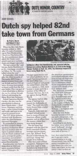 Le Capitaine B. était dans l'armée américaine et il avait combattu en Normandie. Il avait survécu au jour du débarquement et à l'opération « Market Garden », dont il est question dans le film Un pont trop loin, et plus tard, il a combattu dans la partie nord des Pays-Bas pour libérer le Camp Westerbork et arrêter le dernier train de Juifs à destination des chambres à gaz. La ferme de mon père était près du Camp Westerbork. J'apportais de la nourriture pour la cuisine toutes les semaines, mais tous les jours, des Juifs étaient arrêtés aux Pays-Bas et amenés dans les baraques et toutes les semaines, des Juifs partaient en train pour les chambres à gaz en Allemagne. Le Camp Westerbork était un camp de rassemblement avant d'envoyer les gens mourir dans les chambres à gaz.