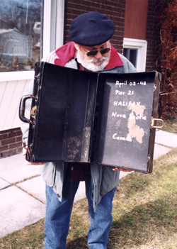 Homme barbu portant un béret bleu, affichant à l’intérieur une vieille valise usée.