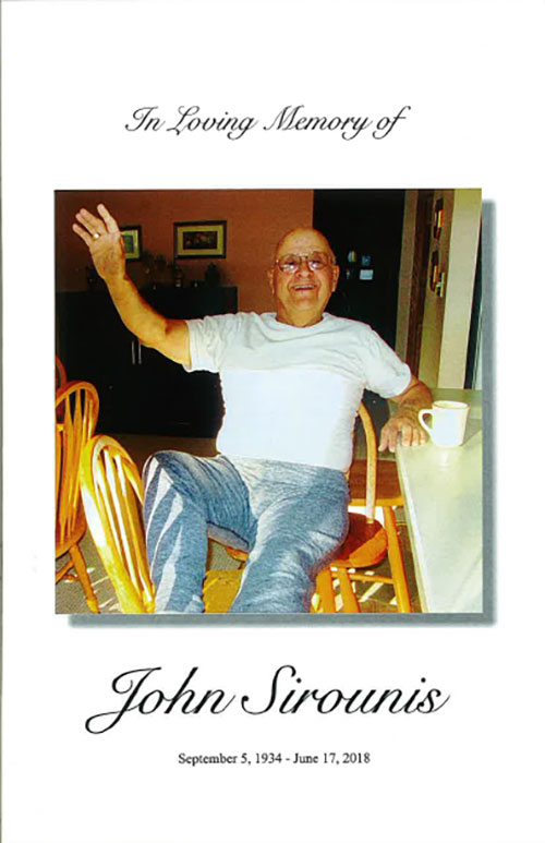 John Sirounis est né le 5 septembre 1934 dans la ville grecque de Kastri. Il était le 5e enfant de Demetrios et d'Aggeliki. Demetrios était un cordonnier prospère, qui travaillait fort, il n'avait pas peur des journées de 12 heures.