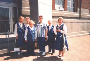 La mère d'Audrey a fait les robes des trois filles. Les demoiselles d'honneur portaient des robes roses et tenaient des bouquets d'iris. Audrey avait un bouquet composé d'œillets roses. Elle avait emprunté le voile de son amie Violet, dont le tissu comportait des séries de points et de tirets qui épelaient V en morse [le symbole de la victoire].