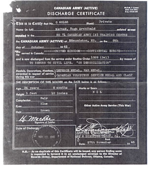 Hugh Archibald MacRae est né à Bayfield, dans le comté de Westmorland, au Nouveau-Brunswick le 21 mars 1912. Il était le plus jeune fils de Norman et Annie (Grant) MacRae. Hugh s'est engagé dans le centre de formation No. 71 de l'armée canadienne (B), il est allé en active à Edmundston, au Nouveau-Brunswick le 8 octobre 1942. Il a servi au Canada, au Royaume-Uni, et en Europe continentale (Hollande et France). Les deux photographies de Hugh en uniforme ont été prises quand il était en Hollande et au dos de la photographie où on le voit debout il y a une inscription, "Hugh Holland". Il a reçu sa décharge conformément à l'ordre de routine 1029 (5c1) pour retourner à la vie civile le 27 novembre 1946.